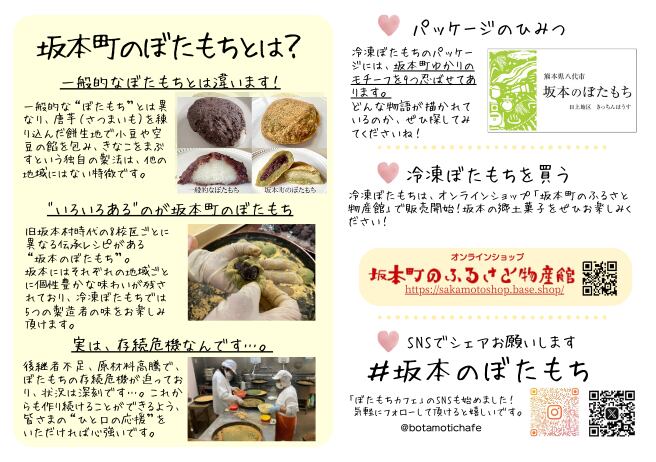 「郷土自慢のぼたもちを、より多くの方に食べていただき、大切な食文化を未来へ繋いでいきたい」また、「令和2年7月の豪雨災害で壊滅的な被害を受けた坂本町の復興に繋げたい」という想いから、新たに「冷凍ぼたもち」の商品化を実現させました。