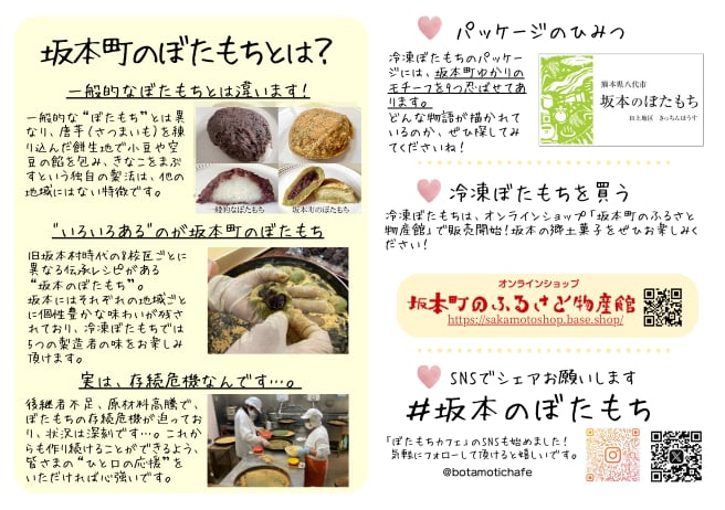 「郷土自慢のぼたもちを、より多くの方に食べていただき、大切な食文化を未来へ繋いでいきたい」また、「令和2年7月の豪雨災害で壊滅的な被害を受けた坂本町の復興に繋げたい」という想いから、新たに「冷凍ぼたもち」の商品化を実現させました。